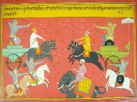 | Description / विवरण | Miniature painting based on Mahabharat - Drona parva. The painting depicts the fighting seen of Bhim and Duryodhana. As Duryodhan began to defeat than king of Magudh come to protect that riding on elephant. |