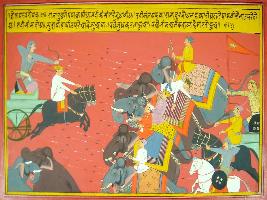 | Description / विवरण | Miniature painting based on Mahabharat - Drona parva depicting Sanjay narrating the war scene to Dhritrashtra. He told his that Duryodhna and Bhim attacking on each other like two elephant. |