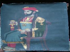 | Description / विवरण | It is a painting of a king, shown holding a sword and decorated with red turban, and pearl and gem studded necklace seated on chair. |
