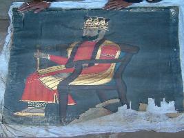 | Description / विवरण | It is a painting in which a king is shown sited on a chair, wearing golden shoes, golden crown and red Roman toga, have golden work. |