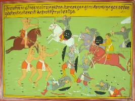 | Description / विवरण | Miniature painting based on Mahabharat - Drona parva depicting demolition of Kauravas army, alone by Ghatotkach with defferent weapons. |