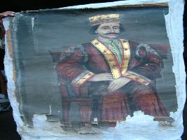 | Description / विवरण | It is a painting of a king shown sitting on a chair wearing an ocher and golden color long coat, long mustaches and a golden cap having floral design. |