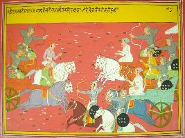 | Description / विवरण | Miniature painting based on Mahabharat - Drona parva. It depicts king of Pandya state with his army and Swissen stoping him on the way. |