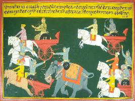 | Description / विवरण | Miniature painting based on Mahabharat - Drona parva depicting Sanjay Narrating war secne to Dhritrashtra and tells win that Arjun asking Krishna to drive his charriot toward a massive elephant, which belongs to Kauravas. |