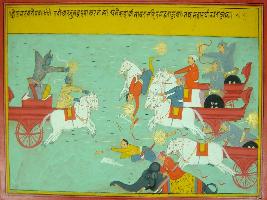 | Description / विवरण | Miniature painting based on Mahabharat - Drona parva depicting the Kurukshetra war, where Arjun release brahmastra from his gandiv that killed many elephant and soldiers. |
