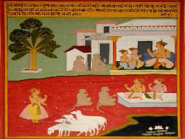 | Description / विवरण | Miniature painting based on Panchtantra depicting in the upper part a king is telling something to two men and two monkeys. In the lower part two men are depicted saying something to two monkeys and a man feeding to 6 goats. |