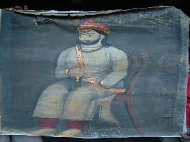 | Description / विवरण | It is a painting of a king shown holding a golden hilt, have a golden red cap on heat with crescent tilak on forehead and floral decoration coat. |