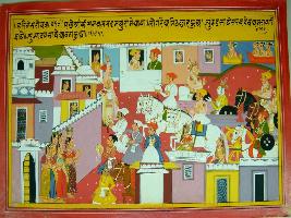 | Description / विवरण | Miniature painting based on Harivansha depicting the arrival of Krishna and Balram to Mathura. People are welcoming them with enthusiasm. At the upper left corner Indra is seen with other Devtas in Amravati. |
