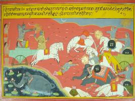 | Description / विवरण | Miniature painting based on Mahabharat - Drona parva depicting the brahmastra of Arjun killed many soldiers including Bhagadatta. The brahmastra cut the head and hands of the soldiers in the way an elephant take out lotus from the pond with his trunk. |