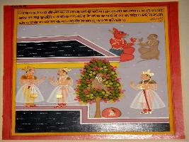 | Description / विवरण | Miniature painting based on Panchtantra depicting asking why his men are not coming out from the pond. Then the monkey replied that he took the revenge of killing other monkeys. It also depict the demon telling the monkey that he satisfied him. |