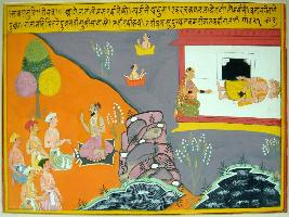 | Description / विवरण | Miniature painting based on Ekadashi Mahatmya depicting the scene that ministers of king meet sage and ask reason why there king not having child. Sage told all the Migsar he has done wrong deed in past. It is incomplete painting. |
