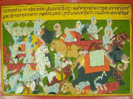| Description / विवरण | Miniature painting based on Mahabharat - Shalya parva depicting war scene. Many soldiers are depicted dying fighting. Elephants depicted crushing chariots. Feared with Bhim, Duryodhan told his Charioteer to twin chariot, it is happening wrong. |