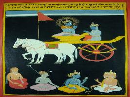 | Description / विवरण | Miniature painting based on Shri Bhagwat Gita. It depicts Krishna preaching Arjun that when one does penance without body and in the end he leaves three goons . |