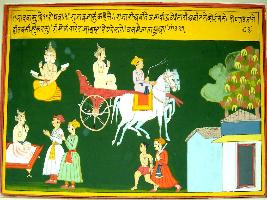| Description / विवरण | Miniature painting based on Ekadashi Mahatmya depicting Ekadashi worship of Bhadav month depicting a king worried due to its peoples, so he reaches Brahma and by Brahma s direction, he worships on that day and get rid of his reason of worry. |