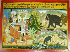 | Description / विवरण | Miniature painting based on Harivansha depicting that a Rawat Nagari is attacked by demons and on the left side wild animals are seen. |