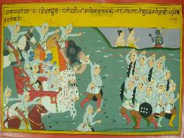| Description / विवरण | Miniature painting based on Mahabharat - Shalya parva. Dustadumna depicted coming to help Bhim. Bhim is depicted fighting in such a way like Yam taking ones life. |