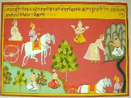 | Description / विवरण | Miniature painting based on Ekadashi Mahatmya depicting Ekadashi of Bhadav month depicting a king reaches to hermitage of a sage by order of Lord Brahma, worships him and moves ahead. |