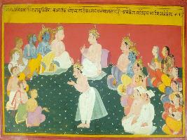 | Description / विवरण | Miniature painting based on Mahabharat - Rajdharma parva depicting Yudhisthir, Krishna, Vedvyas with other Pandavas and warrio are shown sitting in condolence ceremony. Yudhisthir rose from his seat and bwed with folded hand in front of Vedvyas. |