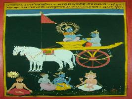 | Description / विवरण | Miniature painting based on Shri Bhagwat Gita. It depicts Krishna preaching Arjun that whatever gun quality of man which take him above, is expression of his gun. |