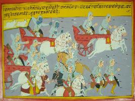 | Description / विवरण | Miniature painting based on Mahabharat - Shalya parva. Sanjay tells Dritarasta thathis army is defeating, Pandavas are raining arrow on KauraVS and they are fleeing like as bull runs from bull. |