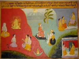 | Description / विवरण | Miniature painting based on Sanskrit drama - Prabodh Chandrodaya where a writer declares that he is going to compose a Sanskrit drama, who knows very well about Akash, Vayu and Agni. |