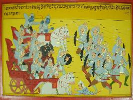 | Description / विवरण | Miniature painting based on Mahabharat - Shalya parva depicting war between Pandavas and Kauravas. Dristadumn is depicted leading Pandavas army. |