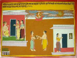 | Description / विवरण | Miniature painting based on Harivansha depicting two women talking to a seated male at the right part. In the other parts, the painting depicts that a woman who gives donations and serves her husband goes to heaven. |