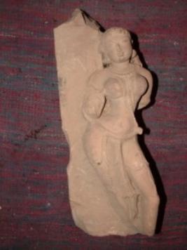 | Description / विवरण | This is a Tribhanga style of a lady identified as Alasa kanya. Her hair are ornamented. She in well ornamented, her eyes are elongated and limbs are proportioned. It is partially broken. |