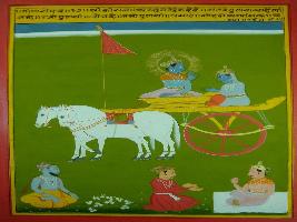 | Description / विवरण | Miniature painting based on Shri Bhagwat Gita. It depicts Krishna preaching Arjun that the man who has good character become wise day by day while it happened just opposite with a greedy and proud man. |