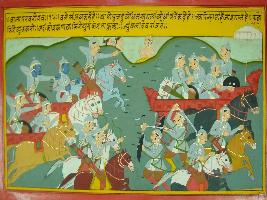 | Description / विवरण | Miniature painting based on Mahabharat - Shalya parva. Sanjay is telling Dhritarastra that Duryodhan is telling to his army that not to turn back and fight, victory definitely will be theirs and the warrrios turned and started fighting again. |