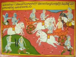 | Description / विवरण | Miniature painting based on Mahabharat - Shalya parva. On the painting Sanjay says to Dhritrashtra that Kripacharya is telling to Duryodhana that all one finished and it should be make a treaty with Pandavas. |