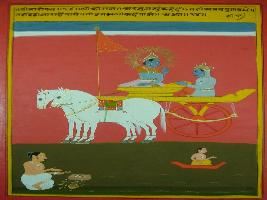 | Description / विवरण | Miniature painting based on Shri Bhagwat Gita. It depicts Krishna preaching Arjun that if people increase Satvaguna then they can easily abandon their body and attain uttamlok . |