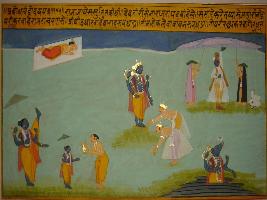 | Description / विवरण | Miniature painting based on Sanskrit drama - Prabodh Chandrodaya depicting A man is sleeping in the upper right side. In the other parts incarnations of Vishnu are depicted, they are Trivikram prvaman avatar Vamana , Varaha avatar and Govardhan dhari Krishna. In the middle part, Vishnu is being worshipped by two men. |