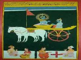 | Description / विवरण | Miniature painting based on Shri Bhagwat Gita. It depicts Krishna preaching Arjun that he who is attracted and attached with lust and desire could not do best works and keep engaged himself in luxury. |