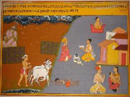 | Description / विवरण | Miniature painting based on Ekadashi Mahatmya depicting the importance of keeping Ekadashi vrat of Bhado month. On one side a farmer is shown ploughing the field and the other side is general scenes. |