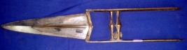 | Description / विवरण | Iron Katar with conical shaped double edged blade and U shaped handle with two bhughi where golden koft work also seen. |