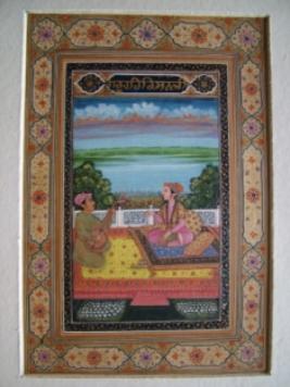 | Description / विवरण | The painting is made very ornamented in a photo frame manner . Guru Hari Krishna is listening to music from a man wearing green jama with purple turban and playing Vina. Guru is wearing purple jama with golden overcoat printed by golden and red flowers respectively. He is wearing mughlite turban. |