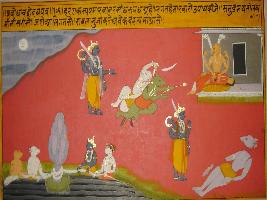 | Description / विवरण | Miniature painting based on Sanskrit drama - Prabodh Chandrodaya depicting Narasimha killing Hiranyakashyap, a scene of Samudra manthan and Vishnu killing many demons. |