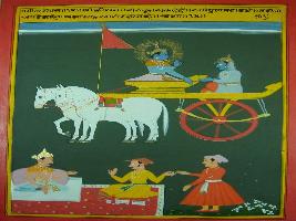 | Description / विवरण | Miniature painting based on Shri Bhagwat Gita. It depicts Krishna preaching Arjun those who bind in rajogun they fall in greed and desires, they could not do respectful works. |
