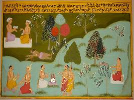 | Description / विवरण | Miniature painting based on Ekadashi Mahatmya depicting the importance and fruitfulness of keeping Ekadashi vrat of Asad month. On top two people shown talking on the lower part three Brahmans are shown performing yagna. |