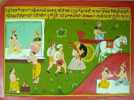 | Description / विवरण | Miniature painting based on Harivansha depicting two seated persons on the right upper corner, below it, two sages are performing sacrifice. In the centre a king is seated in a chariot followed by three armed man, while on the left lower part a king is seated with a sage. |