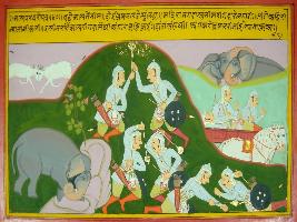 | Description / विवरण | Miniature painting based on Mahabharat - Shalya parva depicting Bhim and Shalya is fighting with their mace in the way two bulls fight. Fire sparks from their mace in the way two elephants fight. |