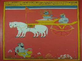| Description / विवरण | Miniature painting based on Shri Bhagwat Gita. It depicts Krishna preaching Arjun that through learning one can increase their Satvaguna . |