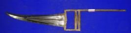 | Description / विवरण | Iron katar having slightly curved blade with grooves and iron handle with two bhogli. The handle has golden koft work and one side of the handle is broken. |