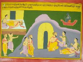 | Description / विवरण | Miniature painting based on Mahabharat - Rajdharma parva depicting story of Karna served Parshuram and learned shooting bow and arrows. One day Parshuram is sleeping and Karna pressing his feet when he is bitten by one insect. |