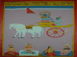 | Description / विवरण | Miniature painting based on Shri Bhagwat Gita. It depicts Krishna preaching Arjun about different guns like Satgun, Rajogun, Tamogun. |