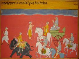 | Description / विवरण | Miniature painting based on Sanskrit drama - Prabodh Chandrodaya depicting a king sitting in his chariot, along with his army in the left side. A messenger is standing with folded hands in front of the king. |