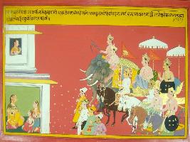 | Description / विवरण | Miniature painting based on Mahabharat - Rajdharma parva depicting different kings including Karna curse to Kalinga, for the Swayamvar of Princess Chirangada. |