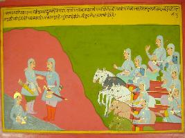 | Description / विवरण | Miniature painting based on Mahabharat - Shalya parva depicting war field. On one side, Pandavas are there and on other side, only Duryodhan left alive. Dhritrashtra asked Sanjay that what are left in Pandavas army. He told him that they had two thousand chariot warriors, five thousand horse riders, and one lakh soldiers. Duryodham become very tired. Kripacharya, Kritvarma and Ashwatham are very sad. Sanjay told him, they killed Dhristdhyum. |