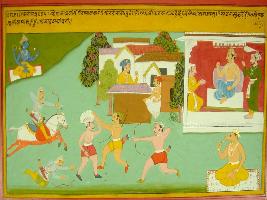 | Description / विवरण | Miniature painting based on Mahabharat - Rajdharma parva. On the painting Vyas says that the king who follow the roles of the creation is the best king and achieve place in heaven. |